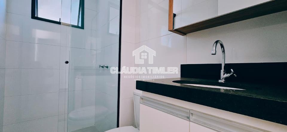 Sala de estar, sacada com churrasqueira, banheiro social com box, 01 quarto, 01 suíte, cozinha com armário embutido, cooktop e coifa já instalados, área de serviço e 01 vaga de garagem.