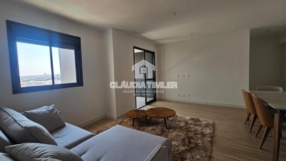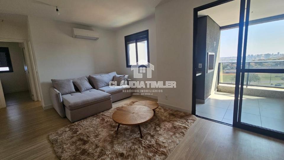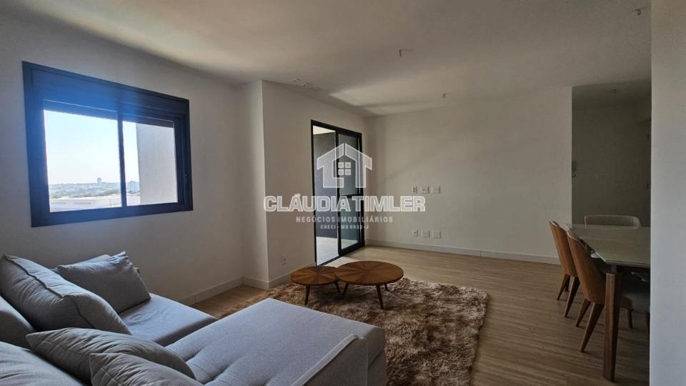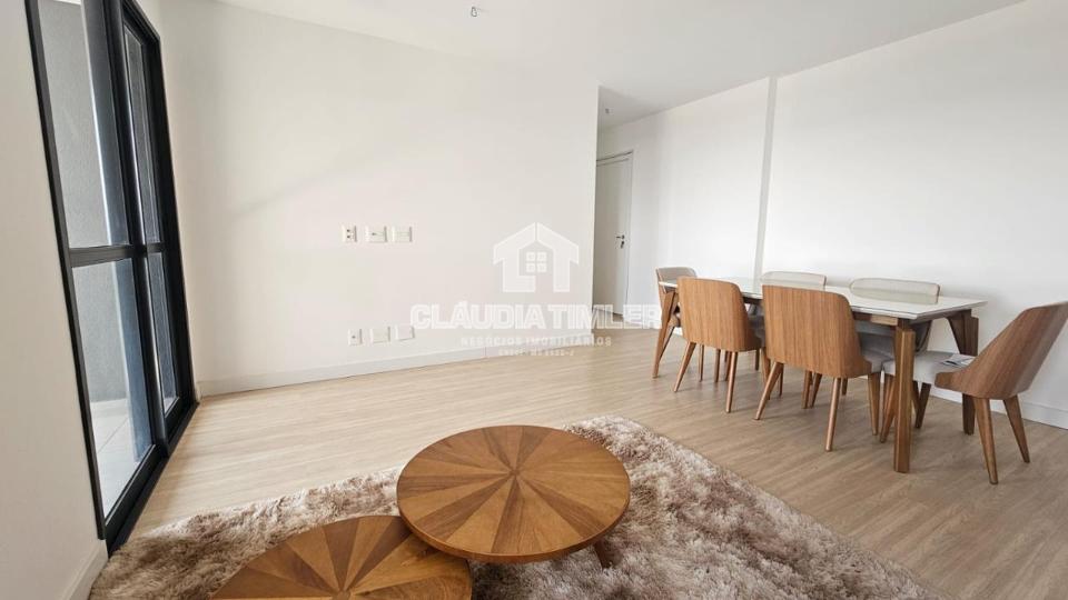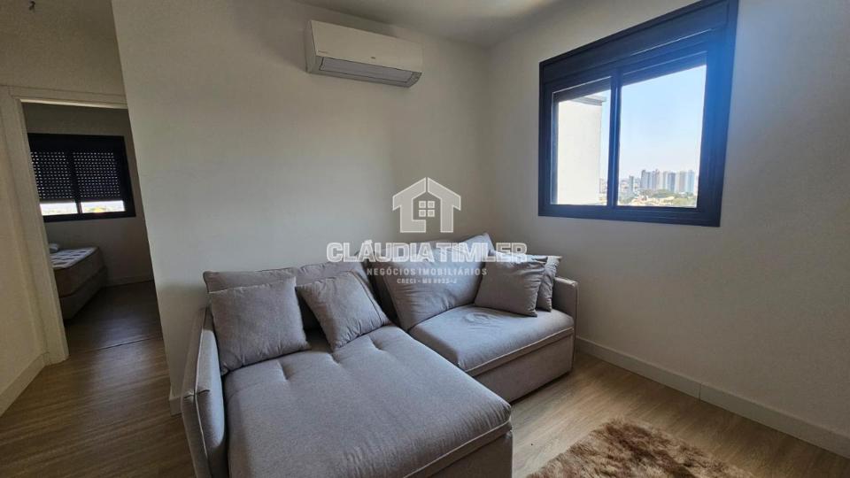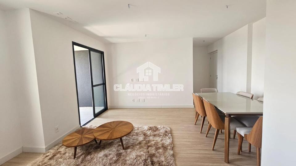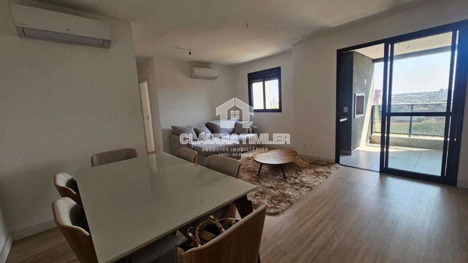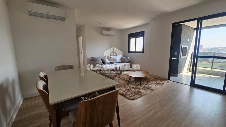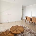Sala estendida para 3 ambientes com sofá para 2 lugares, mesa em laca e 6 estofadas, 2 mesinhas de centro de madeira, tapete e ar condicionado Fujitsu. Um espaço na sala pode ser revertido em um terceiro dormitório